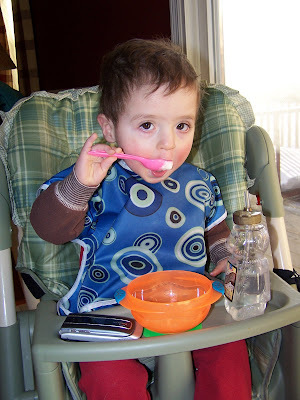 Eric is good with a spoon! Emma has mastered forks, but not spoons. Such cute pics of the snow, too. I wish we could play in the snow.